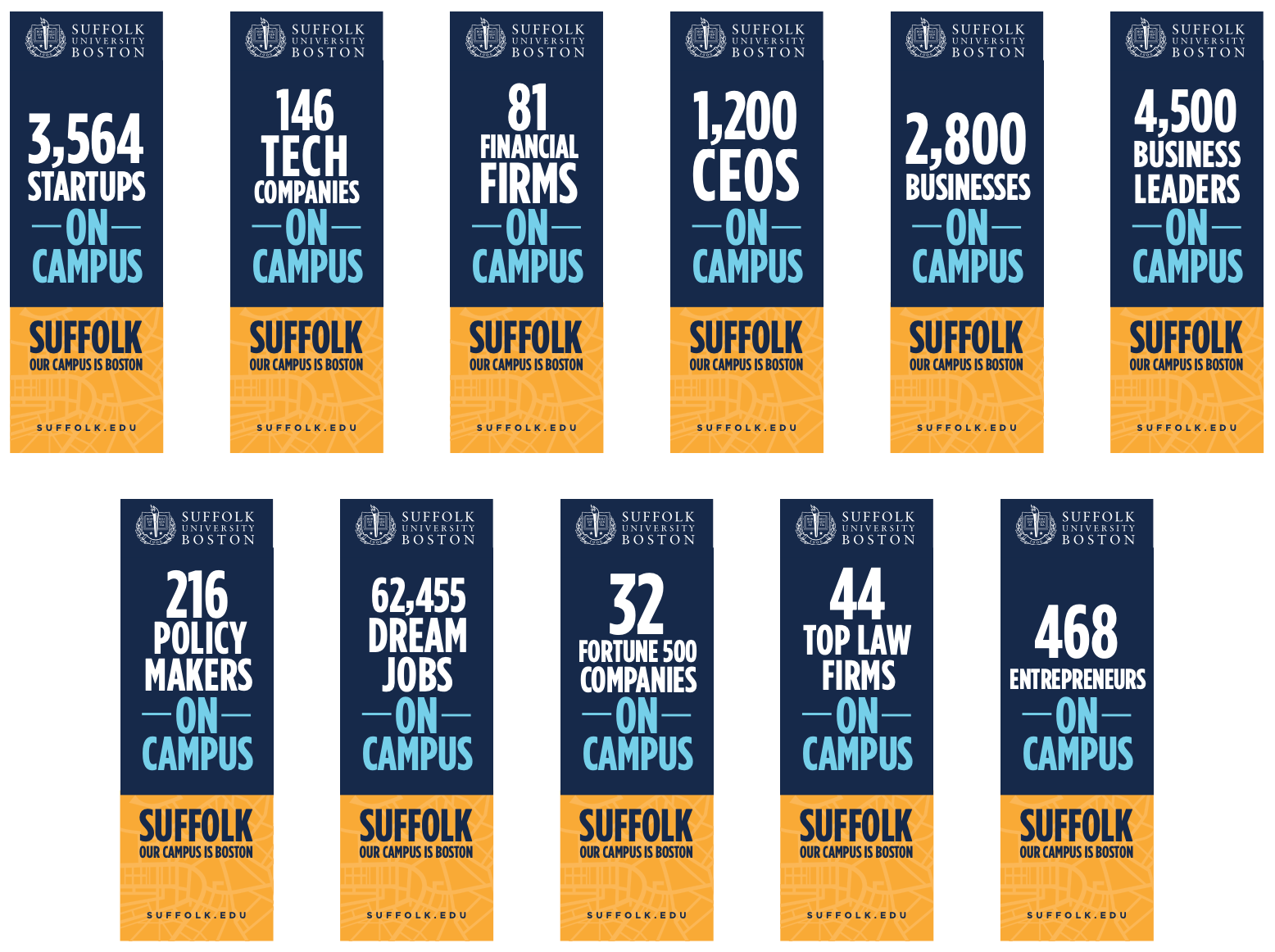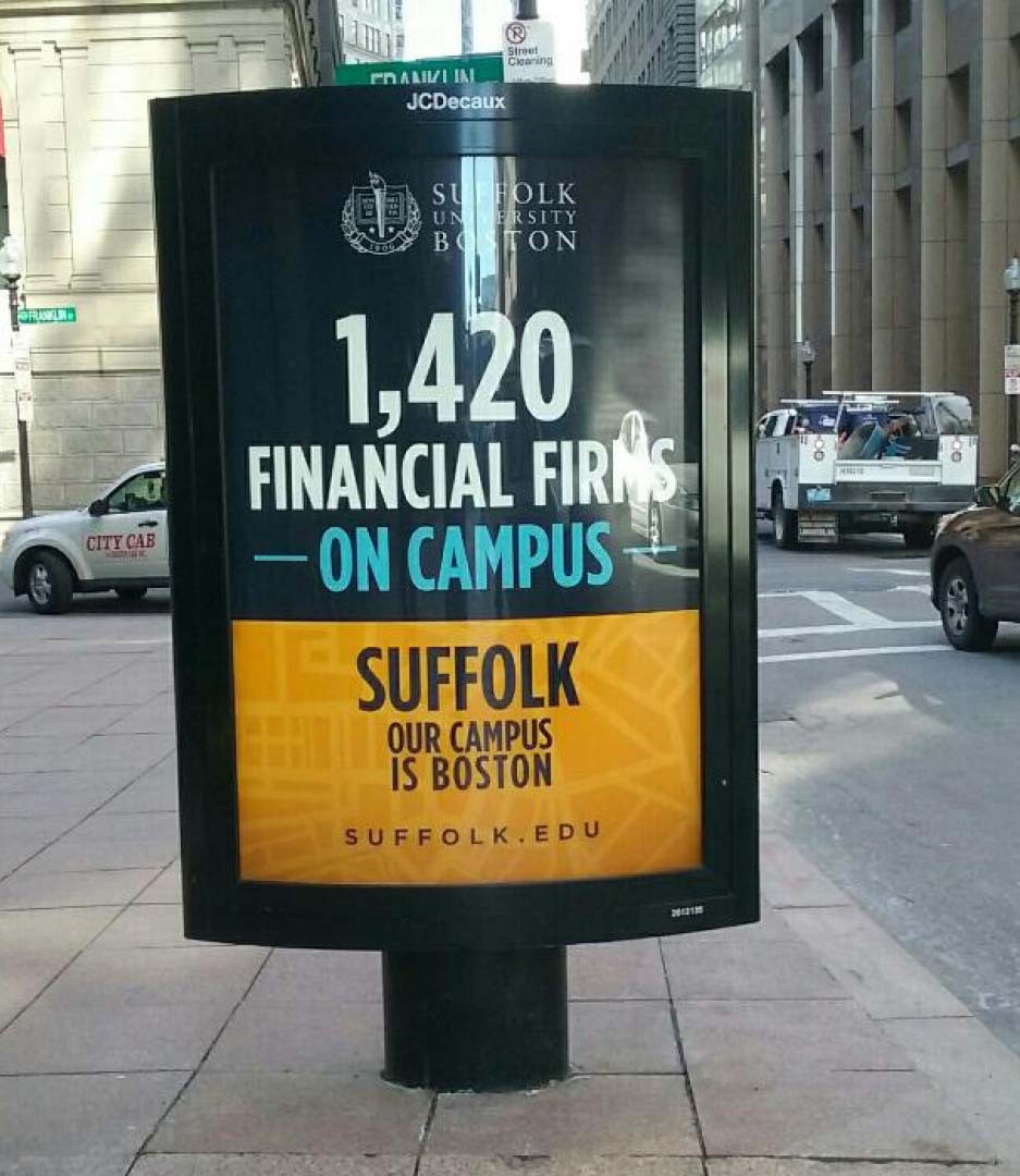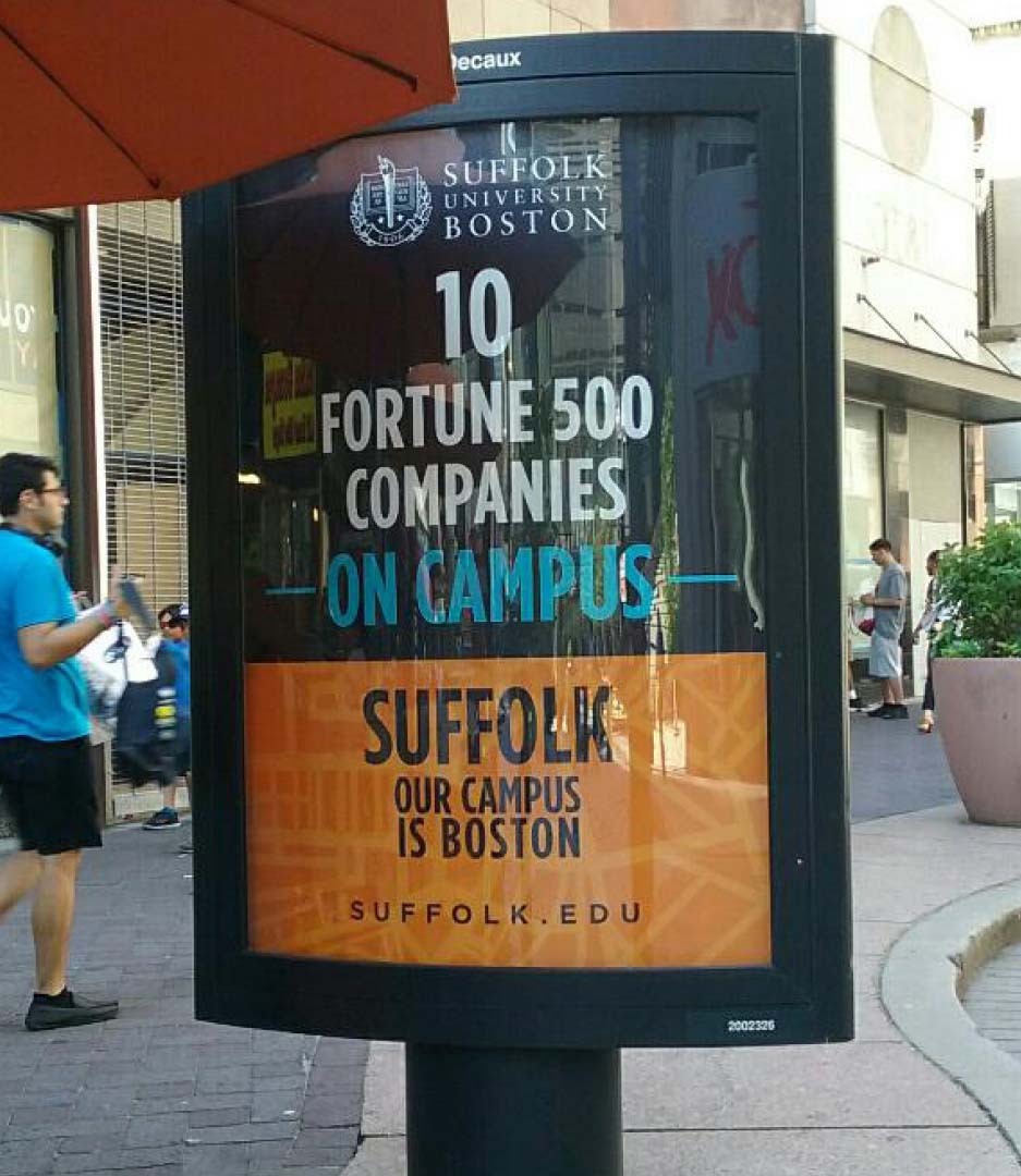 The value of a college education is under fire. Suffolk's downtown Boston location and deep relationships with state government, non-profits, and the business community, offer rich internship and employment opportunities. Boston is also a major draw to both domestic and foreign students. The "Our Campus is Boston" campaign was one element in our overall program. Media took advantage of a high visibility, "takeover" approach in downtown locations to reinforce the message to prospective students, parents, businesspeople and tourists.